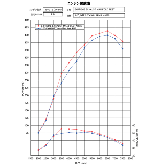 軽さにこだわらず、1JZ用エキゾーストマニホールドとしての要項を満たす為、製造方法は鋳造を採用しています。ノーマル比要量アップと排気圧力のダウン、そして集合部分の効率について見直しを行うことでブーストアップやポン付けタービン使用時に効果的な形状に仕上げました。