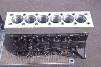 ブロック単体でシリンダーホーニング、ボーリングや、計測を行っても、実際にボルトを締め付けて、シリンダーヘッドを取り付けた(組み立てた)状態になると、各部の変形によって0.01mm単位で数値や形状が変化していきます。 そのため、厳密にシリンダーホーニング、ボーリングを行う際は、ダミーヘッドおよび、ヘッドガスケットを取り付け、シリンダーヘッドを取り付けた状態を再現しなければなりません。 これによりホーニングおよび、ボーリングの加工精度と、その後のエンジン組付精度は著しく向上します。 However cylinder horning, boring, and measurement have performed to the single engine block, when cylinder head is attached and head bolt is actually assembled, numerical value and form of the engine block will be changed from modification or distortion of each part in 0.01mm degree. Therefore, in case cylinder horning and boring are performed strictly, the statement of the engine block that the head gasket and the cylinder head is attached, have to be reproduced by assembling dummy head and gasket. Thereby, the processing accuracy of horning and drilling, and the accuracy of subsequent engine assembly will be improved remarkably. |