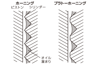一般のホーニングでは、シリンダー内壁面にクロスハッチの溝を付け、ここにオイルを溜めて摺動をスムーズにする方法がとられます。 しかしながら、その壁面は面粗度が大きくなり、ピストンリングと馴染まず、むしろピストン運動の抵抗となってしまいます。 TOMEIのプラトーホーニングは、このクロスハッチの状態から溝の頂部のみを研摩し、表面をフラットにするもので、これにより、オイルの保持をしつつ、フリクションロスを著しく低減することが可能です。 In general horning, crosshatch pattern is grooved to the surface of the wall of the cylinder to remaining oil for the smoother piston movement. However, in this method, roughness of the cylinder wall surface becomes larger and will not fit with the piston ring, but will become resistance of piston movement rather. Plateau horning of TOMEI can reduce friction loss remarkably by grinding off only the apex of the grooves from the crosshatch, making the surface of the cylinder wall flat while keeping oil between the grooves. |