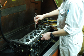 水穴・オイル穴を手作業で細かく洗浄し、そのあとに洗浄機による高温高圧洗浄、高圧エアによる仕上げを行います。 これら3重の工程を経て各部を徹底的に洗浄します。同時に傷・バリ・カエリなど各部の点検を実施します。 Complete cleaning of the water & oil lines is meticulously done by hand manually with each and every block with every orifice and areas checked thoroughly, Then finished off with a high pressure hot wash in a specialized machine and finally completed with a high pressure air clean in evey line,gaps and orifices. This extensive 3 stage process is time consuming but an absolute must to completely eradicate any unwanted burr and foreign material from causing harm to the internals. |