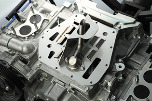 このバッフルステフナーは強度を高めたステフナーを用いて2重構造とし、左右のクランクケースを頑丈に結合することでクランクケースおよびオイルパンの強度を飛躍的に向上させます。