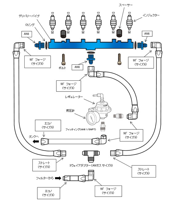 DENSO用 | AN6 | 青 | 186006 | ¥34,800 (税込 ¥38,280) | ・パイプ本体 ・アダプター(3) ・Oリング(3) ・8mmボルト(2) ・スペーサー(2) |