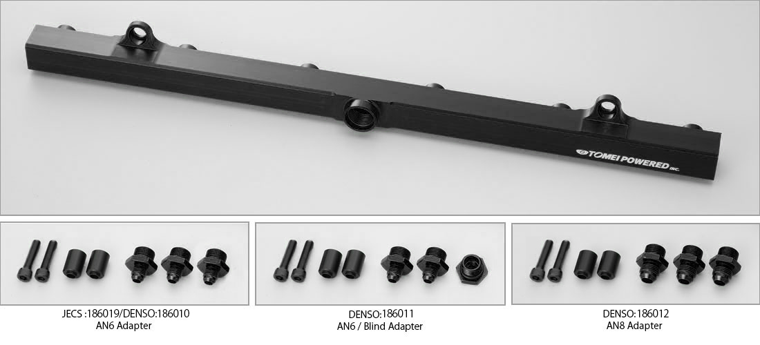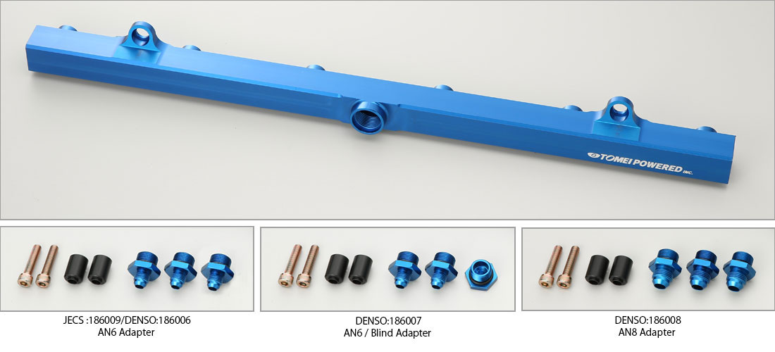 TOMEIフューエルデリバリーパイプは555ccや800ccといった大容量インジェクターを取り付けた際でもガソリンを燃焼室に確実に送り込むパイプ容積や、パーコレーションを防ぐ高い放熱性、ポンプ圧送脈動の除去などチューニングエンジンに必要不可欠な性能を確保したデリバリーパイプです。