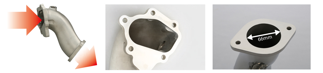 ターボチャージャーからの排気ガスをしっかり受け止め、スムーズにフロントパイプへと流します。■ Wide mouth design & Step-less connection with a 70mm front pipe.
