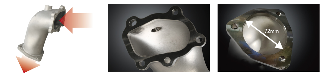 ターボチャージャーからの排気ガスをしっかり受け止め、スムーズにフロントパイプへと流します。■ Wide mouth design & Step-less connection with a 76.3mm front pipe.