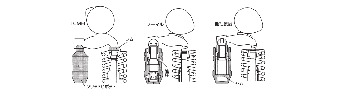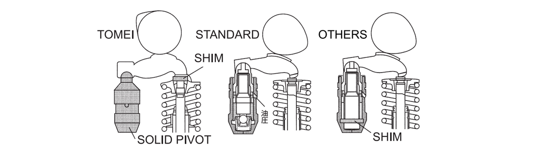 このテーマに対し、TOMEIはソリッドピボット式を採用することで、各シリンダーのピボット全高を一定にしたまま、ソリッド化とカムクリアランス調整を可能にしました。これにより、他社製品に比べ、精密なヘッドシステムを構成できるうえ、作業時間も大幅に短縮できます。