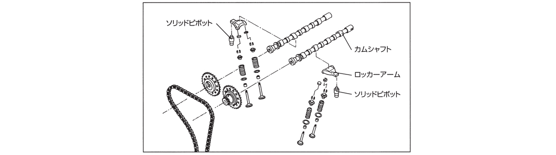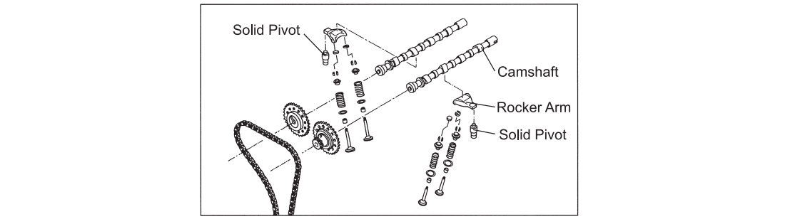 In order to make cam clearance maintenance-free and quieter operation sound, the hydraulic lash adjuster was adopted for the SR20 engine. However when aiming at higher RPM ranges and for higher horsepower output from engine modifications, it is important to improve the reliability of head system parts and to make valve drive train set correctly for the suited cam profile. So it is necessary to eliminate the use of the hydraulic lash adjusters. We have adopted the solid pivot system to enable adequate cam clearance adjustments while keeping total height of pivot of each cylinder fixed. Therefore it is possible to build a more precise head system in a shorter time compare to the other conventional methods. Improvements in the reliability and lower pricing were made possible at the same time by having reduced the number of parts required.