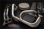 | カムシャフトを交換して得た排気圧力を、より効率良くタービンホイールに当ててやるためにエキゾーストマニホールドを効 率の良い物に交換します。 これにより、大きい排気圧力をスムーズにタービンホイールに当てることができ、更にブーストの立ち上がりが鋭くなります。 但し、EJの場合は排気ポートからタービンまでの距離が非常に遠いため、パイプ径を太くし過ぎてしまうとかえってレスポン スが悪くなってしまいます。また、非等長エキマニを等長に変更する場合、オイルパンも等長用に変更することをお薦めしま す。非等長用オイルパンのままでエキマニを等長化すると、結果的に排気ポートからタービンまでの距離が遠くなってしまう うえに、構造上曲げが増えてしまいレスポンスが悪くなる可能性があります。 The increased exhaust pressure at exhaust manifold, that is increased by upgrading the camshafts, now should be efficiently lead to the turbo for the best performance. The smoother the pressure goes into the turbo, the quicker the turbo spools. On EJ series engine however, too thick pipe diameter to the turbo actually results a poor response because of the long distance from the engine exhaust ports to turbo. Equal -lengthed exhaust manifold may require the oil pan to also replace on models with factory unequal-lengthed exhaust manifold. | |