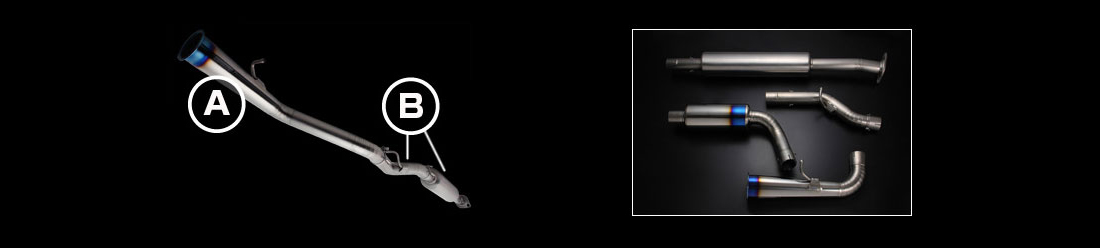 純正形状がどのようなものであろうと、排気効率と、重量軽減の追求のためのシングル配管。ただし、排気音が耳障りなものにならないよう、効率を落とさずに音質を整えてあります。 Compared with the stock design, our design is single piping all the way for max weight reduction. We have also focused on the design of the muffler to produce the best exhaust sound without compromising performance.B : メインパイプMAIN PIPE
