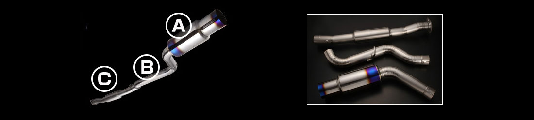 純正形状がどのようなものであろうと、排気効率と、重量軽減の追求のためのシングル配管。ただし、排気音が耳障りなものにならないよう、効率を落とさずに音質を整えてあります。 Compared with the stock design, our design is single piping all the way for max weight reduction. We have also focused on the design of the muffler to produce the best exhaust sound without compromising performance.B : メインパイプMAIN PIPE